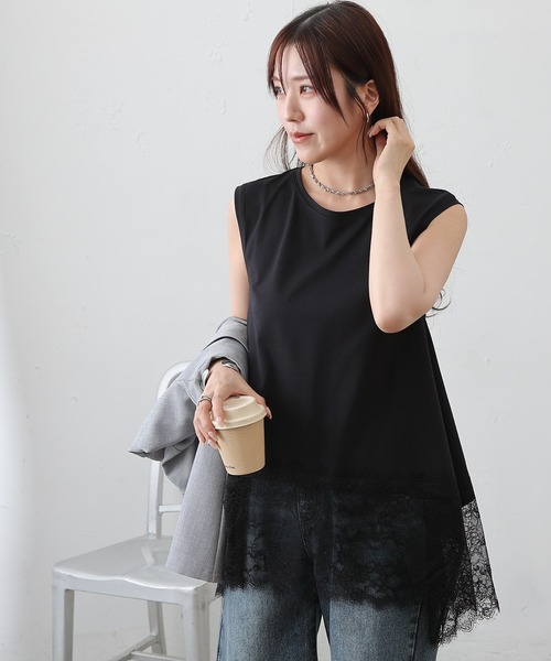 【重ね着に大活躍のイレヘムレーストップス】裾にあしらった繊細なレースと、動きのあるイレギュラーヘムが目を引くノースリーブプルオーバーです。裾の上品なレースでシンプルながらも華やかなイメージになります。左右で長さに変化を持たせたイレヘムデザインが自然に縦ラインを強調し、視線を下に流すことでスタイルアップ効果も期待できます◎程よくゆとりを持たせたシルエットで体のラインを拾いにくいのも嬉しいポイント。ノースリーブでも肌見せが控えめで、1枚着はもちろんジャケットやカーディガンのインナーとしても着回しやすいのがポイントです。大きめなトップスの下に重ねてレース部分のみ出す合わせ方も今年らしさが取り入れられてオススメです◎普段のコーデにプラスするだけで印象を変えられる万能アイテムです。【商品ポイント】・普段のコーデにプラスするだけで今年らしさを取り入れられる・上品なレースで華やかな印象に・イレヘムデザインでスタイルアップ効果大【裾レースシリーズ】・CWA1061206A0009 裾レースイレヘムTシャツ----------------------------------------------------■商品特徴洗 濯 方 法 :手洗い可裏 地 :なし透 け 感 :ホワイトのみややあり伸 縮 性 :なし光 沢 感 :なし生地の厚さ:普通----------------------------------------------------■素材本体: 綿65%, ポリエステル35%裾レース: ナイロン86%, ポリウレタン14%---------------------------------------------------- ※着用、お取り扱いの際は、商品についている品質表示とアテンションタグを必ずご確認下さい。※商品タグに記載されている商品名がWEBでの表記名と異なる場合があります。※実際の商品と仕様、加工、サイズが若干異なる場合がございます。※照明の関係により、実際よりもやや明るく見える場合がございます。またパソコンなどの環境により、若干製品と画像のカラーが異なる場合もございます。予めご了承くださいませ。【お気に入り登録】してお得な情報をCHECK!!・「商品のお気に入り登録」で再入荷通知や、ラストの通知、セール通知も受け取ることができます。・「ブランドのお気に入り登録」で新商品や再入荷など、お得な情報を受け取ることができます。