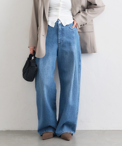 ルーズなシルエットが魅力のNEWデニム。 フロントにタックを施し、バックは切り替えを入れることで、裾に向かってほんのり丸みのあるシルエットに仕上げました。 全体的にリラックス感がありながら、ヒップまわりはタックを広げすぎずボリュームを抑え、脚がすっきりときれいに見えるバランスに。 無地のブルーと、スプレー加工でピンクのニュアンスを加えたブルーの2色展開です。 ※取り扱いについては、商品についている品質表示でご確認ください。 ※染料の性質上、着用や洗濯により色落ちし、白っぽくなります。スレによる色落ち、色移りにご注意ください。 ※配色が濃淡の製品は色移りすることがあるので、汗をかいたり、雨や水に濡れたままの放置はお避けください。 ※この製品は、加工により独特の素材感を持たせています。 そのため、一点一点に微妙な色、サイズ、風合いなどの違いがあります。 ※こちらの商品はU by SPICK&SPAN店舗での取り扱いになります。 直接店舗へお問い合わせの際は、U by SPICK&SPAN店舗までお願い致します。 ※照明の関係により、実際よりも色味が違って見える場合があります。 またパソコン・スマートフォンなどの環境により、若干製品と画像のカラーが異なる場合もございます。 ※商品の色味は、商品アップ画像をご参照ください。 ブルーA・サックスブルー着用スタッフ:157cm 着用サイズ:38 詳細着用モデル:162cm 着用サイズ:38 ※こちらの商品はU by SPICK&SPAN店舗での取り扱いになります。 直接店舗へお問い合わせの際は、U by SPICK&SPAN店舗までお願い致します。 ※照明の関係により、実際よりも色味が違って見える場合があります。 またパソコン・スマートフォンなどの環境により、若干製品と画像のカラーが異なる場合もございます。 ※商品の色味は、商品アップ画像をご参照ください。 ブルーA・サックスブルー着用スタッフ:157cm 着用サイズ:38 詳細着用モデル:162cm 着用サイズ:38 本体:洗濯機洗い(弱)