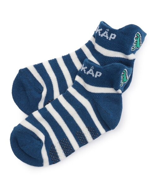 明るい配色でまとめたボーダー柄のスニーカーインソックスです。 かかとの上にあしらわれている恐竜刺しゅうが可愛いポイント。 通気性に優れたメッシュ編みではき心地が良く、デイリー使いにおすすめです。 足裏には快適な歩行に役立つすべり止めプリントを備えました。