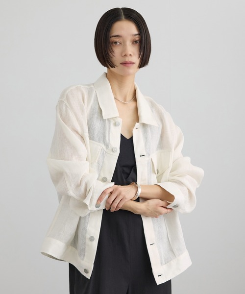 上品な透け感のリネン素材で軽やかに羽織れる、抜け感のある大人のシアーデニムジャケット■デザイン/シルエットメンズライクになりがちなデニムジャケットを、シアー感のあるリネン素材で仕立てることで上品かつ軽やかな印象に。程よくゆとりを持たせながらも縦長ラインを強調し、すっきりとしたシルエットを実現しました。長袖でも通気性に優れ、暑い時期でも快適に着用可能。ナチュラルな表面感がコーディネートに奥行きを与え、鮮度のある羽織として活躍します。■素材リネン100%のカラミ(メッシュ)素材を使用。清涼感のあるクリーンな印象と上品な透け感が魅力で、麻特有のさらりとしたタッチが季節にマッチ。軽やかで通気性が高く、春夏シーズンに最適な素材です。■コーディネートシルクパンツなど艶感のあるボトムと合わせた異素材ミックスがおすすめ。ワンピースの羽織としてもバランスよく、デニムやワイドパンツと合わせれば大人カジュアルに仕上がります。■モデル身長:166cm 着用サイズ:F-----------------------------裏地:なし光沢感:なし透け感:あり伸縮性:なし生地の厚さ:普通-----------------------------
