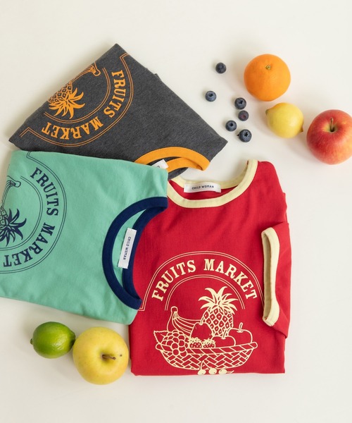 夏らしい遊び心あふれる元気な配色が目を引くリンガーTシャツ。プリントにはレトロなフルーツ屋さんのショッパーをイメージした、夏らしいトロピカルなフルーツがカゴに盛られています。ラバープリントを通常よりも厚盛で仕上げることで、より立体的で存在感のあるプリントに。程よいツヤ感がフルーツの瑞々しさを表現しています。リンガー部分はいつもより少し細くすることで、スッキリとした印象に。程よくゆとりがありつつも、大き過ぎないシルエットなので、インでもアウトでも使いやすいサイズ感です。定番ボトムと合わせてコーディネートの主役にも、キャミワンピースやサロペットのインナー使いとしても◎暑い夏に身に付けるだけでも気分を上げてくれるようなそんなTシャツです。--------------------透け感:なし伸縮性:ややあり光沢感:なし-----------------------【素材の特性・お取り扱いの注意】・取り扱いの注意については取り扱い表示をよくご確認の上、着用をお願い致します。・この製品は厚みがあるプリント加工をしております。着用や洗濯の繰り返しや摩擦により、ひび割れや脱落変色や色落ちすることがあります。また、色移りの可能性があるため、保管の際はプリント部分に他のものが当たらないようにしてください。濡れたままの放置やつけ置き洗い、プリント部分のアイロンはお避けください。※撮影画像は、光の当たり具合やモニターの環境により色味が違って見える場合があります。あらかじめご了承ください。※着用の商品はサンプルで撮影しております。お届けする実際の商品と仕様、加工、サイズが若干異なる場合がございます。