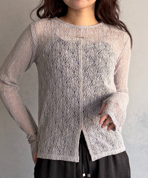 ほどよい透け感のラッセルレーストップス 【Point】 ストレッチ性が高く、繊細でイレギュラーな表情のレースが目を引くシアートップス。 ほどよい透け感がシーズンムードを高め、女性らしさを引き立てます。 柔らかく伸縮性のある生地で、ストレスフリーな着心地も魅力。 ブランドロゴのメタルパーツがさりげないアクセントに。 センタースリット入りで、アウトスタイルでもすっきりとした抜け感を演出します。 長めの袖丈とすっきりとしたクルーネックで、細部までこだわった一着です。 【Styling】 程よいフィット感のあるサイジングで、トップス使いはもちろん、 ジャケットやシャツのインナーとしても幅広く活躍。 長めの袖丈が腕のラインをきれいに見せ、インナー使いでもかさばりにくいのが嬉しいポイントです。 ワンピースやジャケット合わせのきれいめ・モードスタイルと好相性。 デニムやワイドパンツなど、カジュアルスタイルのアクセントにもおすすめです。 ---------------------------------------------------- 【Detail】 ・イン・アウトどちらでも着用可能な、トップス兼インナーとして使える万能アイテム ・ストレッチ性に優れたシアー生地で着心地も◎ ・適度なフィット感で細見えのシルエット ・入学式や結婚式などのオケージョンシーンにもオススメ 透け感/あり 光沢感/なし 伸縮性/あり 生地の厚さ/やや薄い ---------------------------------------------------- ※撮影場所により、実際の色味と若干異なる場合がございます。 またパソコン・スマートフォンなどの環境により、若干製品と画像のカラーが異なる場合もございます。予めご了承ください。 ※商品画像はサンプルのため、色味やサイズ等の仕様に変更がある場合がございますので、予めご了承ください。 ---------------------------------------------------- 【お買い物を楽しんで頂く為に】 ■商品のお気に入り登録 お気に入りの登録をして頂きますと 完売カラーの再入荷通知や、ラスト1点の通知を受け取ることができます。 ■ブランドのお気に入り登録 新商品の発売や再入荷、タイムセールやクーポン発行のお知らせなど &g'aimeがお届けするお得な情報を受け取ることができます。