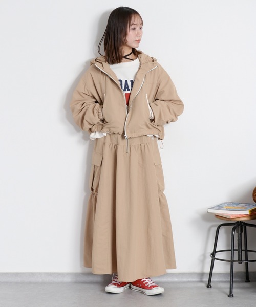 〈cepo〉グログランナイロンセットアップシリーズ。撥水・UV・ウォッシャブルの機能を兼ね備えた高性能のナイロンカーゴスカート。◇Point◇昨年から大好評をいただいているグログランナイロンシリーズが新たにアップデート♪耐久性のあるグログラン素材を使用した、とにかく楽に履けるイージースカートです。撥水・UVカット・イージーケアなウォッシャブル。これからの季節にマストな機能が盛りだくさん!シティ・アウトドア・フェス・レジャー、あらゆるシーンでコーデにマッチする汎用性の高さがポイントです。スカートは前後2wayで着用が可能。フロントはドローコード付き、バックは着脱を楽にするジッパー付きです。ウエストはゴム仕様でイージーな履き心地。ウエストのコードで調節も簡単です(ウエストは約20cm伸びます)。サイドにはアクセントになる大きめカーゴポケット。収納力も抜群です◎。シルエットはボリュームのあるフレアシルエット。動くたびにふんわり揺れる、足さばきの良い1本です。アクティブに見えがちなナイロンスカートにドレープ感を持たせることで上品さをプラスしました♪同素材のグログランシリーズは以下の品番も展開しております。ぜひご覧ください。単品でも使いやすいですが、スポーツテイスト溢れるセットアップコーデもおすすめです。・CCB-0827 グログランショートパンツ・CCB-0828 グログランロングスカート・CCB-0829 2wayグログランショートドロストジャケット・CCB-0830 2wayグログランハーフドロストジャケット◇Material◇しなやかな質感と微光沢が魅力のグログラン素材。ハリのあるナイロンを使用しています。とにかく軽いです!グログランは糸の織り目を横に高くした織り方で、凹凸が生まれることで上品な光沢感とハリがあります。もちろん耐久性も◎。シワになりずらいのも嬉しいポイント♪ご家庭での洗濯も可能です。軽さがあり、小さく折りたたむことも可能なので旅行やレジャーにも最適です。※裏地なし。グレーはやや透け感があります。※サイドフラップポケット付き。◇Coordinate◇cepoスタッフイチ押しはグログランショートジャケットとのセットアップコーデ!スポーティーなのにどこか上品さを感じられるセットアップです。ジャケットのショート丈も相まってスタイルアップ効果も◎。単体でも汎用性の高いアイテム。ウエスト周りにアクセントがあるのでタックインスタイルもおすすめ。スカートにボリュームがあるのでコンパクトなTシャツとも好相性。足元はブーツで合わせればワークテイストに、スニーカーでストリートスタイルに、パンプスで合わせれば通勤スタイルにも使えます。※照明や天候により実際の色味と異なって見える場合がございます。ご了承くださいませ。【キーワード】#Y2K#10代#20代#30代#40代#50代#アウトドア#フェスコーデ#春コーデ#梅雨#スポーツ#レジャー#イージーケア#自転車