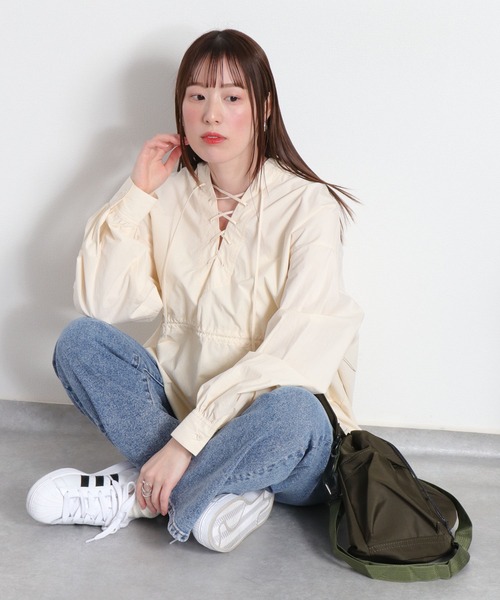 ちょっとした羽織としても大活躍♪ レースアップでキレイめなシャツにフードをプラスしたオトナカジュアルな1着。 ◇Point◇ ワイドシルエットで春から夏にかけて一枚着でも、羽織としても活躍します♪ あえて肩幅を大きめに取り、着用時に肩が落ちて華奢に見えるようデザインにもこだわっています。 着丈を長めに設定しているので気になるヒップ周りもカバー◎。 ウェスト部分についたドロストでその日の気分で調節可能♩ 「ちょっとそこまで」のときにもバサッと羽織れる着回し抜群☺︎ ◇Material◇ 綿100%なので着心地抜群。シワも気にせず着用いただけます。 インナー次第でオールシーズン◎ 胸元のレースアップは調節可能なので、胸元ゆったりめの日もあれば キュッときつめにして、首元まで紐が見えるようにするもの可愛いですよ♪ ◇Coordinate◇ 肌寒い時期はタートルニットでややモードに合わせるのも◎。 ピクニックなどのレジャーシーンのアウターとして、散歩のときの日焼け対策として。 様々なシーンで使い回しできるライトアウター的なシャツブラウスです! ※照明や天候により実際の色味と異なって見える場合がございます。ご了承くださいませ。 【キーワード】 #Y2K#10代#20代#30代#40代#50代#ライトアウター#日焼け対策#冷房対策#ルーズシャツ#フーディー