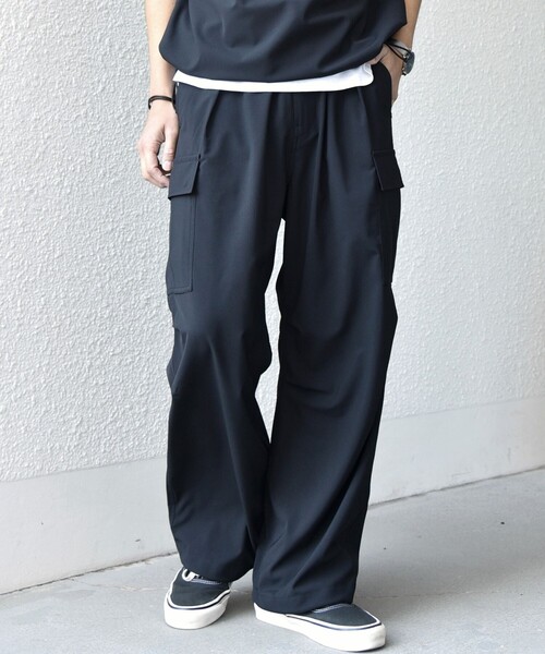 吸水速乾機能が嬉しい!大人が穿きやすい、きれいめカーゴパンツ 【素材特性】 夏に最適な高機能素材「COOLMAX(R)/クールマックス」を使用した、Rapidry(ラピッドライ)。 Rapid(急速な)とDry(乾く)をつなぎ合わせた速乾性を表現した素材名です。 吸水性と速乾性に優れているので、ドライタッチな質感と軽量な点が盛夏にピッタリ! ご家庭でメンテナンスがしやすく取扱いのしやすさが◎ 【デザイン】 トレンド感がありながら、大人の方も穿きやすいキレイめなカーゴパンツ。 ワイドシルエットに加え、ウエストゴム&ドローコード仕様で快適な穿き心地。 ワンタックのデザインがリラックス感をプラスし、ストレスフリーな着用感を実現します。 また、裾のスピンドルコードでシルエットを調整でき、コーディネートの幅が広がるのも魅力。 同じくRapidry素材のジャケットやプルオーバーシャツも展開しておりますので、お好みでセットアップでの着用もおすすめです! 【Rapidryシリーズはこちら】 ◆〈吸水速乾〉Rapidry バンドスキッパー スピンドル プルオーバー シャツ(セットアップ対応) 711-13-0020 ◆〈吸水速乾〉Rapidry ボタンダウン レギュラーカラー 半袖 シャツ 711-53-0017 ◆〈吸水速乾〉Rapidry クルーネック スピンドル ポケット Tシャツ 711-53-0018 ◆〈吸水速乾〉Rapidry クリース アンクル テーパード イージーパンツ(セットアップ対応) 26SS 713-13-0049 ◆〈吸水速乾〉Rapidry ポケット ジャケット(セットアップ対応) 26SS 717-03-0003 ※モールサイトにより(ハイフン/-)抜きでの品番表記となります。 ---------------------------- 裏地:無 光沢感:無 生地の厚み:薄手 伸縮性:無 透け感:無 水洗い:洗濯機可 ---------------------------- 【注意事項】 ※末永く愛用頂く為に、アテンションタグ・洗濯ネームを必ずご確認の上、着用又はお取り扱いください。 ※撮影環境による光の当たり具合やパソコン・スマートフォンなどの閲覧環境によって、実際の色味と異なって見える場合があります。 商品の色味は商品単体で撮影した画像をご参照ください。 ※画像の商品はサンプルです。 実際の商品と仕様、加工、サイズが若干異なる場合がございます。