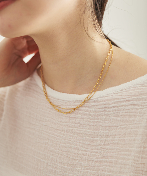 ※先方品番:1602268001※カラーについて弊社販売カラー名:メーカーカラー名ゴールド(090):YG※サイズについてフリー(009):1しなやかで美しい輝きを放つ、2連ネックレス。角が丸く柔らかな印象の長小豆(ロングオーバル)チェーンと、リズミカルに輝く喜平(カーブ)チェーンを組み合わせたデザイン。異なる表情のチェーンが重なり合うことで、シンプルながら奥行きのある輝きを演出します。2本重ねて着けるだけでなく、1本ずつ分けたり、2本繋げてロングネックレスにしたりとアレンジ自在。他のジュエリーとも合わせやすく、ひとつ持っているだけでコーディネートの幅が広がるアイテムです。【MARIHA / マリハ】MARIHAが目指しているのは、自分らしさを大切にする大人の女性が毎日でも身に着けることができるタイムレスなデザイン。日本古来の「花鳥風月」 という美意識を大切にしながらひとつひとつの素材やシルエットを丁寧に吟味して、ミニマルかつ繊細なスタイルを創り上げています。パリを拠点にインターナショナルに活動するデザイナー Marie Westonが旅の中で出会った情景からインスピレーションをうけたデザインには、「美しいものを身に着けることで、心も美しく、幸せで満ち溢れるように。」というデザイナー自身の願いが込められており、身につける女性の魅力を美しく引き立て、幸福に満ちた未来へといざなってくれます。※取り扱いについては、商品についている品質表示でご確認ください。※ 店頭及び屋内外での撮影画像は、光の当たり具合で色味が違って見える場合があります。商品の色味は、商品アップ画像をご参照ください。また、お客様のお使いのPCのモニター環境などにより色味が違って見える場合があります。予めご了承の上ご注文ください。