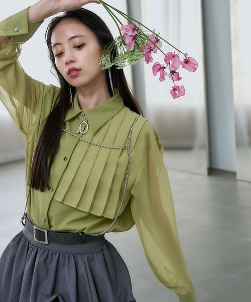 ーーー HAREの定番! シアー素材が切り替えられたプリーツデザインシャツ ーーー point □シアーとポリエステルの異素材切り替えがハレらしいデザイン □アシンメトリーデザインで1枚で主役級のアイテム □落ち感のあるシルエットで着心地抜群 □タックインでもアウトでも着やすい丈感 □微配色仕様でシンプルすぎず、コーディネートのアクセントに styling 骨格ナチュラル:アウトでワイドパンツやマキシ丈のスカートを合わせたゆるめのシルエットが似合います。ボタンを全て開けてさらっと羽織るスタイルもオススメです。 骨格ウェーブ:ハイウエストのワイドパンツやフレアスカートをインして着るのがオススメ。ベルトを付けてウエストを強調すると華奢さが際立ちスタイルアップになります。 骨格ストレート:広がりすぎないストレートシルエットのボトムスと相性◎前だけ軽くインするとスッキリ見えます。ジャケットを羽織るとモード感がアップします。 set item スカートとセットアップで着用可能。 セットアップ対応アイテムはコチラを検索→【640635】 ※加工を施した画像を使用しております。 実物と色味が異なる可能性があるため、色味は詳細後ろにある生地寄り画像を参考にお願いいたします。 あらかじめご了承下さい。