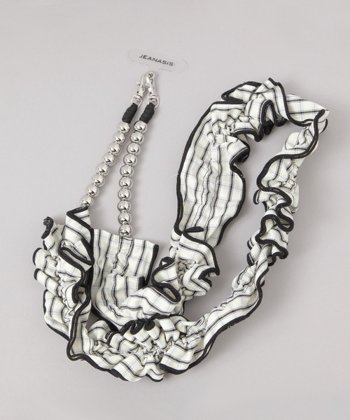 ーーー アウトドアや旅行にもオススメ★ スタイリングのポイントになるスマホショルダー ーーー 甘くなりがちなフリルをチェック生地で仕上げることでJEANASISらしさをプラスしたアイテム。 存在感のあるフリルとビーズがスタイリングのポイントに♪ JEANASISロゴの入ったスマホタグをお気に入りのケースに挟むだけで、使用できるところも嬉しいポイントです。