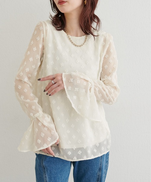 【2026SS LARUTA】[Yurie企画]フラワードット柄ジャガードシアーブラウス■DesignインフルエンサーYurie企画の第二弾が登場!程よいシアー感と、甘くなりすぎないニュアンスの花柄が特徴の大人の上品ブラウス。子育てママでも安心してお召しいただける、インナー付き・袖口ゴム仕様。体のラインを拾いにくい、程よいサイズ感と、全体のシアー感で抜け感をプラス。骨格を気にせず、すっきりと着られる一着です。1枚着としてはもちろん、袖のベルスリーブを生かして、インナーとしても幅広く活躍する万能ブラウスです。■Styling1枚でもお召しいただけるよう裏地が付いているため、とろみサテンスカートやコーデュロイパンツ、デニムパンツなどお好みのボトムスと合わせてさっとお召しいただくのがおすすめ。袖のベルスリーブを生かして、テーラードジャケットやカーディガンを重ねても◎。また、デニムサロペットなどのインナーとしてもお楽しみいただけます。■Fabric柔らかくシアー感のある素材。夏にかけてお召しいただけるさらっとした生地感です。======================透け感:あり裏地:あり伸縮性:ややあり光沢感:なし======================▼ コンセプト<LARUTA>シンプルだけど洗練されていて、それでいて自然体。着飾るよりも着ていてリラックスできる、そんなお洋服を纏いたい気分。※着用、お取り扱いの際は、商品に付いている品質表示とアテンションタグを必ずご確認ください。【お気に入り登録でお得な情報がいっぱい】・「商品のお気に入り登録」で再入荷通知や、ラスト1点の通知、セール通知をいち早く受け取ることができます。・「ブランドのお気に入り登録」で新商品や再入荷など、お得な情報を受け取ることができます!※店舗の入荷時期は商品によって異なります。店頭の在庫状況につきましては各店舗にてお問い合わせください。※撮影時の光の関係で、画面上の画像と実際のお色とでは若干の色差が生じる可能性がございます。また、ご覧いただいているモニター画面や、お使いのブラウザによっても、お色の違いがございますことをあらかじめご了承くださいませ。