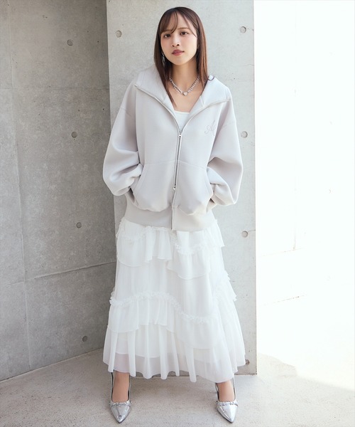 軽やかな揺れ感で魅せる、ティアードチュールスカート 【Design/Styling】 ・繊細なチュール素材を贅沢に重ねた、存在感のあるティアードスカート。 ・歩くたびにふんわりと揺れるシルエットが、女性らしさを引き立ててくれます。 ・段ごとにあしらったフリルディテールが、甘さを添えつつも縦のラインを強調し、スタイルアップ効果も◎ ・ウエストバックはゴム仕様でフィット感がありながら、ストレスフリーな着心地です。 ・ウエストはすっきりとしたデザインなので、トップスをインしてももたつかず、コンパクトなニットやブラウス、ジャケット合わせも好相性! ・フェミニンにもカジュアルにも着回せる万能アイテムで、シーズンレスに活躍します。 ・S、Mの2サイズ展開。 ・ウエストゴム仕様。 【Fabric】 ・軽やかで柔らかなチュール素材を使用し、エアリーな着心地に仕上げました。 ・動きに合わせて美しく揺れるティアードデザインを引き立てる、軽やかな素材使いが特徴です。 ・フリル部分はふんわりと柔らかいシフォン生地を使用。 ・裏地付きで透け感を気にせず安心してご着用いただけます。 ・ご自宅でお手入れが出来るのも嬉しいポイント♪ ・ホワイト、ブラックの2色展開となります。 【Care】 手洗い可能 M:(02):着丈89cm/ウエスト64cm S:(01):着丈87cm/ウエスト61cm