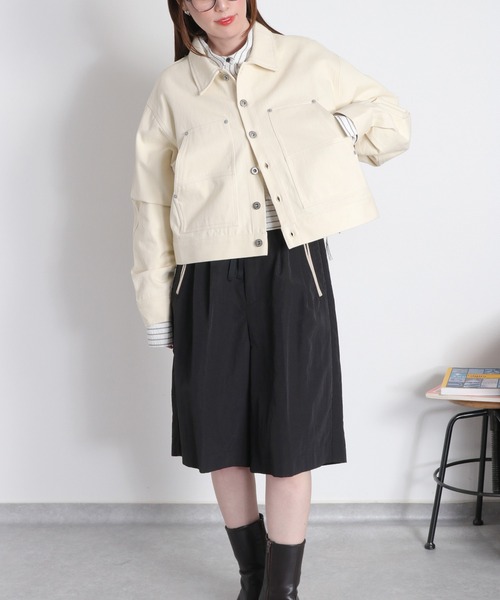 【cepo デニムセットアップシリーズ】ゆるっと着れて、しっかり映える。大人のためのロゴ刺繍デニムジャケット。同素材のデニムパンツ(CCB-0792)と合わせて、今っぽいデニムONデニムのセットアップスタイルが完成します。◇Point◇ワーク感のあるデニムジャケットをベースに、cepo流に〈程よく女性らしく〉アップデート。バックに施したロゴ刺繍が後ろ姿のアクセントに。フロントには実用性の高いワークポケットを配置し、デザイン性と機能性を兼ね備えました。身幅はややゆとりを持たせたリラックスシルエット。ショート丈に仕上げることで、ワイドパンツやナロースカートともバランス良く決まります。肩幅を広めに設計し、自然な落ち感が出るよう仕立てているため、羽織るだけでこなれた印象に。シンプルながら存在感のある一着です。同素材のデニムパンツでこなれたセットアップコーデが可能です。・CCB-0792 刺繍ペインターデニムパンツ◇Material◇コットン100%の程よい厚みのデニム生地を使用。厚手すぎないためロングシーズン活躍します。ブラック・オフホワイトのベーシックカラー展開で、ワークテイストながらも大人っぽく着こなせます。※ご家庭でのお洗濯が可能です。※裏地なし。◇Coordinate◇同素材パンツ(CCB-0792)とのセットアップスタイルがおすすめ。インナーはシンプルなロゴTやコンパクトなリブニットを合わせるとバランス◎。ジャケットは前を開けて抜け感を出したり、袖をロールアップして軽やかに。ゆとりのあるシルエットなので、インナーはすっきりめを選ぶとスタイルアップ効果も。ジャケット単体でも着回し力抜群。キレイめブラウスと合わせれば大人カジュアルに、ロゴTやスウェットで合わせればストリートライクな着こなしも楽しめます。セットアップでも単品でも活躍する、今季ワードローブに加えたい一着です。※照明や天候により実際の色味と異なって見える場合がございます。ご了承くださいませ。【キーワード】#Y2K#10代#20代#30代#40代#50代#春夏コーデ#モノトーン#キレイめデニム#シンプルコーデ#ストリートカジュアル