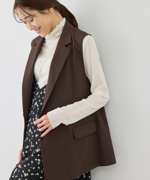 昨年大ヒットの人気シリーズから、春夏のお仕事スタイルに欠かせないテーラードジレが登場。 ジャケット未満の軽やかさで、羽織るだけでお洒落に決まる通勤・デイリーに活躍する一着。【素材感】 ・多機能素材:夏に嬉しいUVカット・接触冷感・抗菌防臭機能を搭載。 ・リネンライク:さらっとした肌離れの良い麻調素材。リネンのような風合いながら、ポリエステル混なのでシワになりにくく、お手入れも簡単。 ・ストレッチ性:糸の織りで伸縮性をプラス。デスクワークや移動時もストレスフリーな着心地。 ・サステナブル:環境に配慮した再生ポリエステルを使用。 【デザイン・シルエット】 ・体型カバーも叶う丈感:ヒップ周りをさりげなく隠してくれる安心の着丈。縦のラインを強調し、スタイルアップ効果も抜群。 ・華奢見え設計:肩幅を広すぎずコンパクトに設定することで、女性らしい華奢な肩ラインを演出。 ・抜け感テーラード:上品な襟デザインながら、ボタン位置を少し下げることで、かっちりしすぎない「大人の抜け感」をプラス。 ・レイヤード自在:Tシャツやタンクトップの上から羽織るだけで、オフィスカジュアルに相応しい清潔感あるスタイルが完成。 【カラー】 ・グレー、ダークブラウン、ベージュ、ネイビーの4色展開。 同シリーズで展開しているグリーン系(35):一部店舗・WEB限定カラーは、こちらの商品では展開しておりません。 【スタイリングポイント】 ・セットアップで最旬に:同素材のパンツやスカートと合わせたセットアップコーデなら、迷わずお洒落なお仕事着が完成。 ・オンオフ兼用:通勤やオフィスカジュアルスタイルにはきれいめブラウスと、休日はロゴTやデニムと合わせてカジュアルダウンするのもおすすめです。 【アップデートポイント】 ・糸の織りでストレッチ性を加えており、お仕事やデイリー使いでも快適な着心地に。 【同シリーズアイテム】 ・テーラードジャケット(品番GDV16100) ・マーメイドスカート(品番GDC16100) ・ベルト付きワイドパンツ(品番GDS16100) ・ガウチョパンツ(品番GDS16110) ----------------------------- 裏地:なし 光沢感:なし 透け感:なし、ベージュ(27)はややあり 伸縮性:ややあり ポケット:あり ボタン:あり(開閉可) 生地の厚さ:やや薄手 季節:春、夏、秋 ----------------------------- ※撮影時の光、お使いのモニター環境によって色の見え方が違う場合がございます。 ※ポケットはしつけ糸で縫われています。着用前にお切りください。 ※2025年秋冬商品より、ワンサイズ展開の商品は「F(フリーサイズ)」表記に変更しております。 詳しい採寸はサイズ欄をご覧ください。 ※前シーズンのカナパ スリーブレスジレ(品番:GDV15120)と同型。 【モデル着用サイズ】 身長:165cm 着用サイズ:F 【2026 Spring/Summer】【26SS】