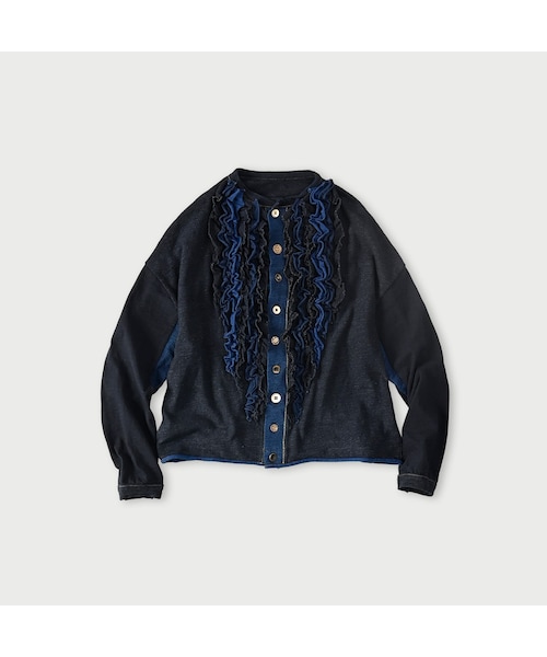 十人十色の、いろいろ天竺ドライタッチで、洗うたびに気持ちのいい大好きなジンバブエコットン。糸の太さや密度をあれこれ変えながら、いろいろな天竺を編みました。染めたての顔も、着て洗って色が抜けたやさしい顔もどんな時も美しいと思えるインディゴで表情の違いを楽しめる工夫をしています。四角いシルエットのカーディガンは、フリルやパイピング、切り替えでたくさんおめかし。ボタンもひとつひとつ表情がちがいます。