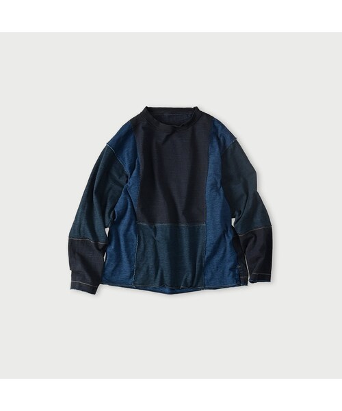 十人十色の、いろいろ天竺ドライタッチで、洗うたびに気持ちのいい大好きなジンバブエコットン。糸の太さや密度をあれこれ変えながら、いろいろな天竺を編みました。染めたての顔も、着て洗って色が抜けたやさしい顔もどんな時も美しいと思えるインディゴで表情の違いを楽しめるいろいろな天竺を編みました。パズルのように組み合わせたパッチワークTシャツ。ニットの特性を活かして布端まで使いました。金茶のステッチがアクセント。ゆったりとしたシルエットです。