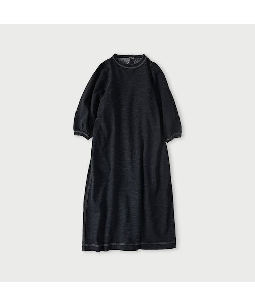 まるでデニム生成の裏糸を2本引き入れて編み立てるデニム天竺はデニムの見た目で、カットソーの着心地。季節の変わり目にちょうどよい厚さで、ムラのあるデニムを表現しました。たった1社でしかつくることのできない貴重で、経年変化が楽しみな素材です。肩幅はキュッとコンパクト。ゆとりあるパフスリーブをセットインしたストレスフリーのドレスです。