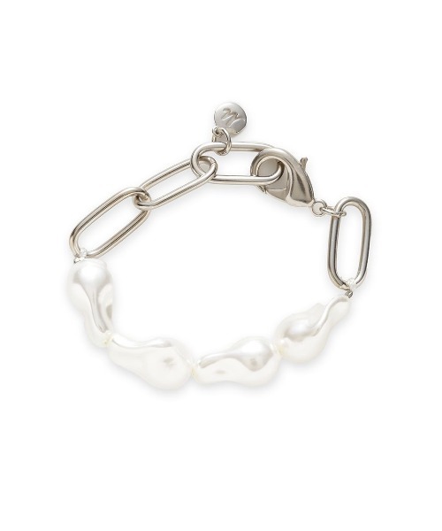 【バロックパールと大きめチェーンが、ダブルで映える。モダンでスタイリッシュなブレスレット】【Design/Styling】パールとチェーンの組合わせが、女性らしいブレスレットです。変形パールと大きめのカンが連なったようなチェーンの、ボリューム感のあるデザイン。見えているパーツで雰囲気ががらりと変わり、飽きずに楽しめるアクセです。コーデを選ばず手元のアクセントとして活躍してくれて、半袖が多くなってくる春夏にも映えるのがポイント。普段使いからオケージョンスタイルまで、さまざまなシーンにマッチするアイテムです。ブランドのMマークが入ったメタルパーツつき。【Color】カラーは2色をご用意。肌馴染みのよい<GLD>、シャープな<SLV>で展開しています。※照明の関係により、実際よりも色味が違って見える場合があります。またパソコン・スマートフォンなどの環境により、若干製品と画像のカラーが異なる場合もございます。予めご了承ください。商品の色味は、商品単品画像をご参照下さい。 ※商品画像はサンプルのため、色味やサイズ等の仕様に変更がある場合がございますので、予めご了承ください。
