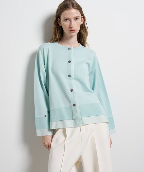 ◇デザイン部分的にシャツをレイヤードさせたかのような、シャツ地とニットのコンビが目を惹くカーディガンです。昨シーズンにも人気だったカーディガンを改良。ボリューム感を抑え、より着用しやすいサイズにアップデートしています。裾や袖口には切りっぱなしの生地を重ねて、軽さを出しながらレイヤード風のデザインに。モードな印象のワイドスリーブは、袖口のループとボタンで太さ調整が可能です。前立て部分も生地とニットのレイヤード風に見せており、縫い込まず、浮かせた仕様で軽さを表現しています。◇ファブリック糸はコットンポリエステルを使用。さらっと清涼感がありながら、ポリエステルのハリ感もあり肌離れが良い素材です。裾に向けて広がるシルエットで前後差のある着丈が、腰やヒップ回りから目線を散らし、カバーしてくれる効果も。春らしいさわやかな色合いや、配色使いも目を惹く1着。-----------------------------裏地:なし光沢感:なし透け:ほぼなし伸縮性:あり生地の厚さ:普通重さ:軽めポケット:なし洗濯:手洗い可------------------------------◇スタイリング一枚で様になるレイヤード風デザインが、大人の「抜け感」を演出。クリーンな白のワイドパンツを合わせれば、春めくエフォートレス・シックな装いに。前後差のある丈感は、細身のパンツやデニムでメリハリをつけるのもおすすめです。◆商品画像はサンプルのため、デザイン、素材(混率等)、色味やサイズなどの仕様に変更がある場合がございますので予めご了承くださいませ。ライトグリーン/ブラック:H174 B78 W61 H88 着用サイズ:38チャコール:H176 B78 W60 H88 着用サイズ:38