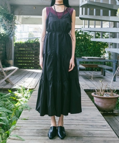 胸元のデザインがモードな印象を与える、ナイロン素材ならではの軽やかなキャミソールワンピース。胸元はメッシュ素材で切り替え、繊細な透け感を添えることで、ヘルシーさと洗練を併せ持つ表情に仕上げています。ウエストにはドローストリングを配し、シルエットの調整が可能。ギャザーから生まれる立体的なフォルムと、裾に向かって緩やかに広がるティアードデザインが、動きに合わせて軽やかな余韻を描きます。肩紐のアジャスターで長さ調整も可能となっており、一枚でさらりと纏うのはもちろん、インナーとのレイヤード次第で印象に変化をもたらし、デイリーからリゾートシーンまで幅広く活躍。スポーティな要素の中に、女性らしい柔らかさを忍ばせたモダンな一着です。--------------------------------透け感 :なし (メッシュ部分のみあり)裏地 :あり伸縮性 :なし光沢感 :ありポケット:あり--------------------------------※画像はサンプルを使用しているため実際にお届けする商品と仕様やサイズが異なる場合がございます。※照明の関係により実際よりも色味が違って見える場合があります。またパソコン・スマートフォンなどの環境により、若干製品と画像のカラーが異なる場合もございます。※実際のお色味は商品単品画像をご確認くださいませ。※商品によってはシワが付きやすく、畳み皺や折り皺が強く出る場合がございます。 洗濯表示や品質をご確認の上、アイロンまたはスチームアイロンをかけていただくことを推奨します。ブランド品番:01-OP187-26-02【sahara/サハラ】遠い記憶、遥か異国の土地、文化、伝統。をコンセプトとし、現代に生きる女性に、ノスタルジックなリアルクローズを提案いたします。●商品のお気に入り登録再入荷、残り1点、セールなどの通知を受け取ることが出来ます。●ブランドのお気に入り登録新商品や再入荷、ショップのおすすめトピックスなど、いち早くブランドのお得な情報を受け取ることができます。