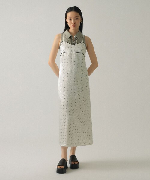 ドット柄×サテンを組み合わせた新作ワンピ ■デザイン 今季大注目のドット柄を施した、大人可愛いキャミソールワンピースが登場。表面感のある上品なサテン生地を使用し、テカリすぎない絶妙な光沢感で高級感を演出しました。 ■コーディネート Tシャツやシアートップスとのレイヤードで、ロングシーズン着回せる1着です。 ■ディテール 胸元とアンダーバストに施したピコレースがアクセント。 ■サイズ 肩紐はバックストラップで長さ調整が可能。 ■素材 左脇のコンシールファスナーと裏地付き仕様で、着脱のしやすさと安心感にもこだわりました。 ■ケア方法 手洗い可(詳細は商品についている品質表示ラベルをご覧ください) 【OFF WHITE】Model:H173 B78 W59 H89 Size:(画像の商品はサンプル用サイズのため実際のサイズ感と異なります) 【BLACK】BEAMS STAFF:H164 Size:(画像の商品はサンプル用サイズのため実際のサイズ感と異なります) ※光の当たり具合やパソコンなどの閲覧環境によって、実際の色味と異なって見える場合がございます。予めご了承ください ※商品の色味は商品単体で撮影した画像をご参照ください。