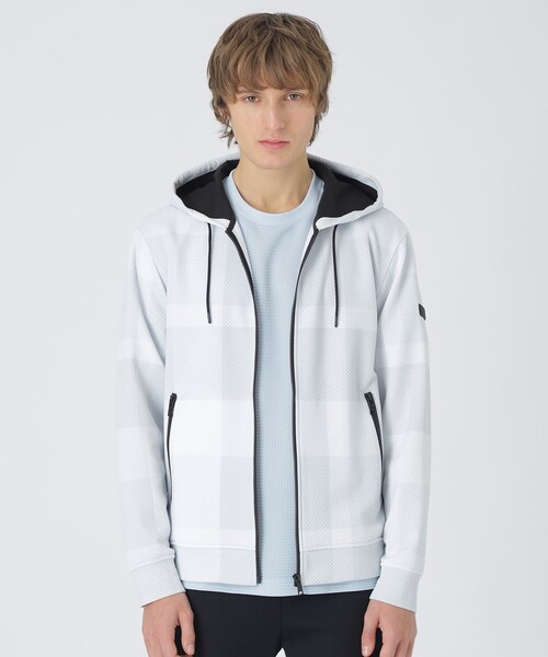 【全面にクレストブリッジチェックをあしらったジップアップパーカー】全面にクレストブリッジチェックをあしらったジップアップパーカー。アイコニックなチェック柄をトーナル(同系色)調のカラーにすることで程良い存在感を演出。軽く程良い肉感の素材で長いシーズン羽織りとして活躍する一着です。ファスナーやドローコードなどのトリムを黒で統一し、大人の落ち着きを感じさせる都会的なデザインに仕上げました。素材にはポリエステルの糸でハニカム状の凹凸がある組織に編み上げた生地を使用。伸縮性抜群でサラリとした肌触りに仕上がっています。緻密なチェック柄はプリントによって表現。生地の編立から加工・プリントを日本にて丁寧に作り上げたメイドインジャパンの素材です。【BLACK lab.】・・・ファッション性と機能性を兼ね備えたスポーティーなカジュアルウェアコレクション。