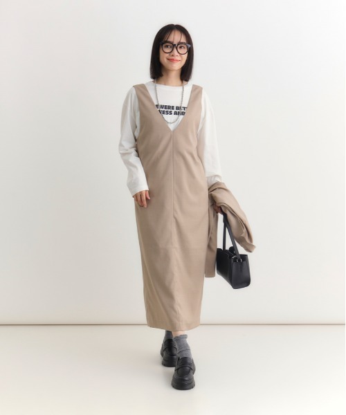 深めVネックと計算されたナローシルエットで、こなれた大人の縦長スタイルを叶える一着。【仕様】深めのVネックが顔まわりをシャープに見せ、広がりすぎないナローシルエットとセンターシームで縦ラインを強調。身体のラインを拾いすぎない程よいゆとりを持たせつつ、ルーズに見えない洗練されたバランスで設計されています。ジャンパースカートの幼さを抑え、都会的でモダンな印象に仕上げた汎用性の高いデザインです。【素材感】適度なハリと上品な落ち感を併せ持つ滑らかな素材を採用。さらりとした肌触りで長時間の着用でも快適、シワになりにくいイージーケア性も魅力です。マットな質感が上品に映え、きれいめブラウスからカジュアルなカットソーまで幅広いインナーと好相性。季節に合わせたインナーでロングシーズン活躍します。【スタイリングイメージ】ロゴTや薄手カットソー+スニーカーでリラックスした休日スタイルに。タートルネックやリブニットをインしてブーツで引き締めれば、ランチやオフィスにも対応するきれいめコーデに。ブラウスやアクセサリーでフェミニンに寄せるなど、小物使いで表情を変えられる一枚です【おすすめポイント】・センターシームで縦ラインを強調し視覚的なスタイルアップ効果・深めVネックとナローシルエットで大人の抜け感と上品さを両立・シワになりにくい素材とイージーケア性でデイリーからお出かけまで活躍【こんなシーンにおすすめ】・休日のカジュアルなお出かけをきれいめに見せたいときに・インナーを替えてロングシーズン着回したい日常のワードローブに・タートル+ブーツでまとめて、ちょっとしたオフィスカジュアルにも※着用はイメージになります。商品の色味は商品単体画像をご確認ください。ーーーーーーーーーーーーーーーーーーーーーーーーーーーーお得に&便利にお買い物を楽しむポイント♪▶商品のお気に入り登録( ♥ハートマーク をクリック)お気に入りアイテムの完売カラーの再入荷通知や、ラスト1点の通知、セールなどの情報をいち早くお届け。▶ショップ・ブランドのお気に入り登録新商品や再入荷、クーポン配布などお得な情報を随時お届け。ーーーーーーーーーーーーーーーーーーーーーーーーーーーー