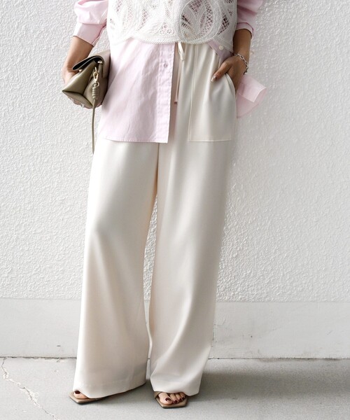 ご好評により新色「ナチュラル」が登場! ■規定数量に達し次第、締め切りとなります ■デザイン ウエストをドロスト仕様にしたリラックス感と女性らしい柔らかさを添えるベイカードロストパンツ。 紐で調整可能なウエストでフィット感を変えられ、体型を問わず快適な着心地です。 程よくルーズなシルエットが脚のラインを拾わずスッキリとした印象にワークディテールのベイカーポケットがさりげないアクセントになっています。 ■素材 生地の特徴としてはシックアンドシンを使用したウール(梳毛)調合繊です。 ストレッチ性があり、着心地の良いシャリ感もプラスされております。 UVカット・防シワの機能性があり、まだ寒い時期から春の暖かくなってからの季節まで使えます。 春に向かっていくにつれて日差しが強くなり、気温も高くなってくる為、着用する際に、快適な素材となります。 ※オフホワイトのみ裏地があります ■コーディネート シンプルなドレープがきれいにでるパンツなので、きれいめなコーディネートに取り入れると大人のリラックス感を演出することができます。 まだ寒い時期はニット合わせたりタイツをインすると冬の寒い時期でもロングスパンで活躍してくれるパンツです。 暖かくなってきた時期はTシャツ・ブラウスとの相性も◎。 パンツに落ち感がある素材の為、トップスにニットやカットソーなど合わせるとコーディネートに素材の対比がでておしゃれ見えします。 ■お問い合わせ品番:313-11-3197 ※撮影環境により商品の色味が異なって見える場合がございます。商品のお色味は、物撮り画像をご参考にしてください。 ※末永く愛用頂く為に、アテンションタグを必ずご確認の上、着用又はお取り扱いください。 ※画像の商品はサンプルです。 実際の商品と仕様、加工、サイズが若干異なる場合がございます。