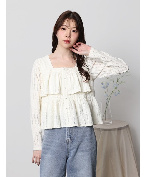 顔周りをシャープに引き立て、デコルテを美しく見せるスクエアネックが印象的な一枚。肩から胸元にかけて施されたティアードフリルデザインが、歩くたびに軽やかに揺れ、ドラマチックで華やかなシルエットを演出します。計算されたネックラインの開き具合が、ヘルシーで洗練された大人の肌見せを叶え、甘くなりすぎない都会的な佇まいへと導きます。腰回りをふんわりとカバーするティアードのボリューム感は、スタイルアップ効果も抜群。デニムを合わせたカジュアルな着こなしから、タイトなスラックスで引き締めたモードな装いまで、幅広いスタイリングの主役として活躍します。日常に優雅なニュアンスを添える、デザイン性に優れたティアードトップスです。