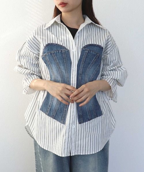 ■商品詳細デニムビスチェがドッキングしたようなデザインのシャツ。 レディライクなデザインにストライプで爽やかさとカジュアルさをプラス。 背中のギャザーもアクセントに。 袖にはゴムが入っていてたくし上げるとボリュームアップしフェミニンな印象に。 前開きなので羽織としても活躍します。--------------------------------------透け感:なし伸縮性:なしケア方法:ドライクリーニング※お洗濯の際は洗濯表示を必ずご確認ください。--------------------------------------<コーディネートmodel160cm><詳細画像model162cm>