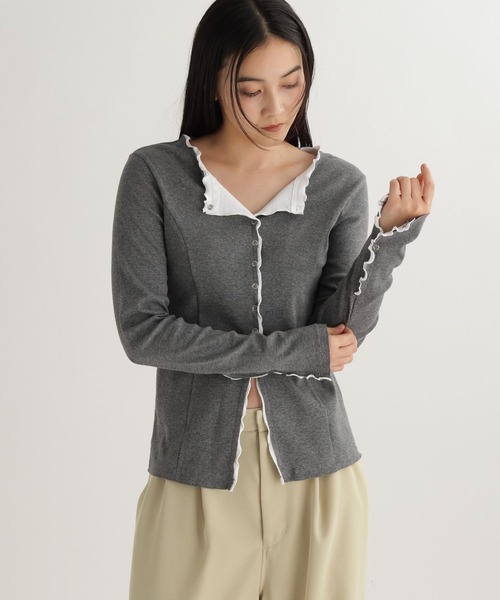 シンプルなスタイリングも格上げトレンド感のあるデザインが魅力のカーディガンーーー【素材】柔らかく肌触りのいい素材を使用。着心地がよく、快適にご着用いただける一着です。【デザイン】レイヤードしているようなデザインが特徴的なカーディガン。コンパクトなシルエットで今年らしいトレンド感のある一着です。第一ボタンを開けて着用するとより配色感をお楽しみいただけます。ーーー【スタイリング】すっきりとしたシルエットなので、ワイドパンツやスカートとの合わせがおすすめ。羽織りとしても一枚あると便利なアイテムです。