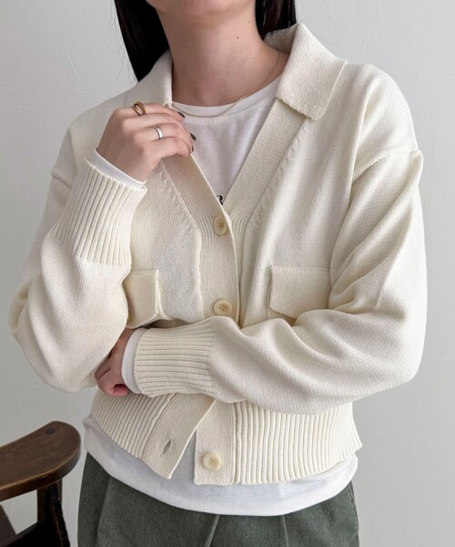 ◇fredy emue◇【2026 SS】着心地軽やかなコットン衿付きカーディガン●point・シャリっとしたタッチの糸を使用したニットカーディガン・Vネックに衿を付けたデザインやフラップ付きのポケットなどディティールにこだわった一枚・コンパクトすぎないサイズ感で、一枚着としても羽織りとしても活躍・柔らかなニット素材で着心地の良さも魅力・パンツにもスカートにも合わせやすく、ロングシーズン頼れるアイテムです●STAFF着用コメント156cmスタッフ:丈は腰まわりが隠れるくらいで、安心感のある長さです。さらっと軽い素材感で、肌に触れても快適です。Tシャツやレースアイテムとのレイヤードもおすすめでした◎透け感:オフホワイトややあり裏地:なし伸縮性:あり光沢感:なし洗濯:手洗い可◇商品のお気に入り登録◇気になる商品は、お気に入り登録がオススメです!クーポン情報、入荷情報が、通知されるようになります。※お手入れの際は、商品についている品質表示タグの取扱い表示をご確認ください。●お取扱い上のご注意●*商品を長くご愛用していただきたいため、アテンションタグがある場合は必ずご確認の上、着用又はお取り扱い下さい。*画像の商品はサンプルとなりますので実際の商品と仕様(主にファスナー・釦等の付属品)、加工、サイズが若干異なる場合がございます。*店頭及び屋外での撮影画像は、光の当たり具合で色味が違って見える場合があります。商品の色味は、スタジオ撮影の画像をご参照下さい。*商品画像に関しては出来る限り忠実に表示出来るよう努めておりますが、お客様がご利用のモニターの設定及び特性により、実際の商品と比較し色味に若干の誤差が生じる場合があります。*製品洗い加工の商品は、多少の歪み、シワなどが見られたり、風合いやサイズ等が1枚1枚異なります。汗や雨等で濡れた時や、摩擦により色落ちし、他の衣料を汚すことがありますので(特に濃色のもの)ご注意ください。*この製品は、生地の特性上引っかかると糸が飛び出しやすい傾向があります。着用時にはベルトやバック、周囲の壁など表面の粗いものとの摩擦や引っかかりにご注意ください。※サンプルでの採寸のため、サイズ表はあくまで目安となります。予めご了承ください。