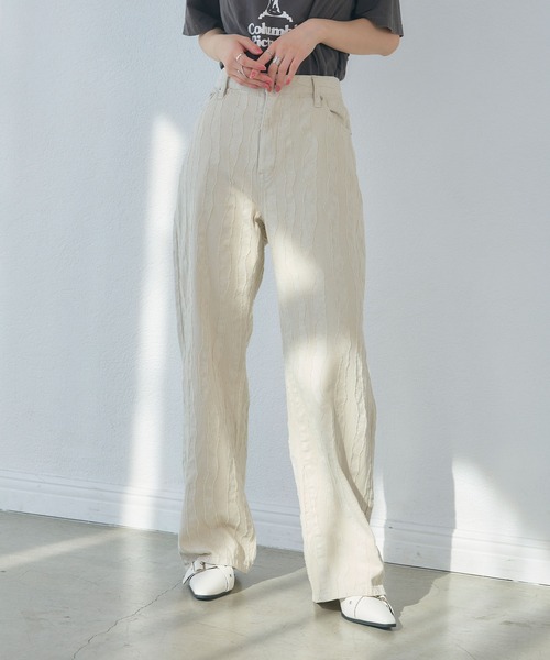 フリンジが映える、脚長ストレートデニム ■Fabric 全体にフリンジが入った程よく緩いストレートシルエットのフリンジデニムパンツ。 やや腰上のハイウエストなのでウエスト周りがスッキリと見え、深めの股上で脚長、スタイルアップも叶います! 全体的にゆったりとしたシルエットのストレートデニムなので華奢見せ効果も◎ デザインデニムに挑戦したことがない方も挑戦しやすく、一年中使える万能アイテムです! ■Style 同素材のフリンジジャガードシャツジャケット(4280183)とセットアップで合わせるとコーデがまとまるのでおすすめです! デザインが入ったパンツなのでお持ちのTシャツとシンプルに合わせるだけでもコーディネートが完成します。 ハイウエストなのでトップスをインすると脚長・スタイルアップ効果に◎ ショート丈やタイトなトップスと合わせるとメリハリがあり、こなれ感のあるコーデを演出できます。 ------------------------------------- 透け感:なし 伸縮性:なし 厚み:普通 洗濯:可 -------------------------------------- ※商品の特性上、色落ち・色移りがある場合がございます。品質表示をご確認の上、お取り扱いにはご注意くださいませ。 ※撮影時のライティング、ご覧になっているモニター・PC環境により実際の商品と色味が異なって見える場合がございます。ご了承の上お買い求め下さい。 ※サンプルにて撮影をしている為、色味や仕様、サイズ等に若干の変更がある場合がございます。予めご了承ください。