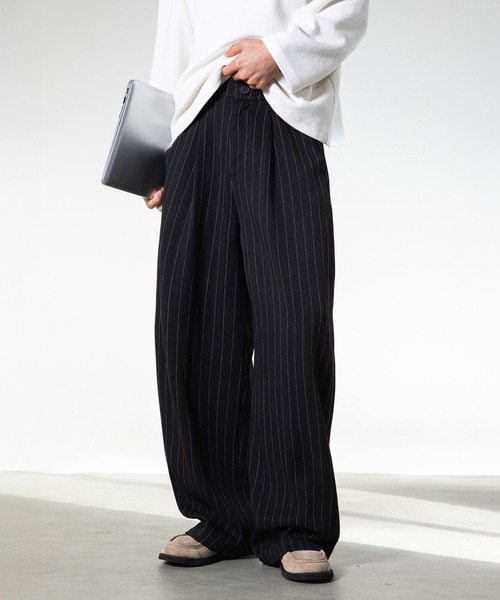 ■リラックス感のあるストライプワイドスラックス ウエストに深いタック加工が施されたお洒落なスラックスです。 側面から背面にのみゴムが入り、トップスをインしたときも綺麗に見えてきちんと感があります。 ゆるっとしたシルエットにデザインされたリラックス感のあるアイテム。 オンオフ両用で着まわて、大人のワードローブにあると便利な一本です。 ■シルエット 程よいボリューム感のあるセミワイドシルエットです。 ■素材 落ち感のあるしなやかなポリエステル素材を使用しています。 ■ディティール サイドからウエストにかけてのみゴムが入り、フロントデザインは綺麗なスラックスのディティールを保ちつつリラックスできる仕様になっています。 ★商品のお気に入り登録→【カートに入れる】右側の♡をクリック 完売カラーの再入荷通知や、ラスト1点の通知、セールの通知も受け取ることができます。 ※店頭及び屋外での撮影画像は、光の当たり具合で色味が違って見える場合があります。またご覧いただきますモニターや使用環境により実際の商品と多少色味が異なって表示される場合がございます。 予めご了承をお願いいたします。