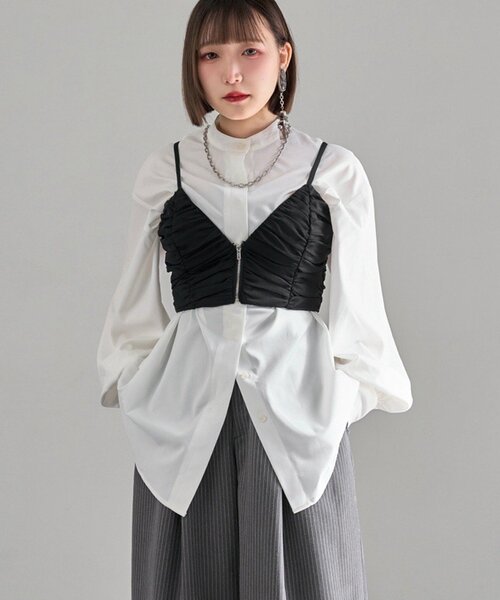 【Mavie..7】by KON(@oniy_suw) 2026 spring collection Instagram公式アカウント→@mavie7_official_ ▼comment by KON ・いつものスタイリングにエッジをプラス。 ・胸元のカッティングとフロントジップがシャープな印象を際立たせるビスチェ。 ・チュールの柔らかな質感とギャザーが、モードな中に女性らしさを演出。 ・レイヤードはもちろん、カップ付きなのでインナー使いも◎。幅広い着こなしが楽しめます。 ・ブラック一色の展開で、トレンドに左右されず長く愛用できるアイテム。。 ================ 裏地:あり 透け感:なし 伸縮性:なし(後ろシャーリング) ================ < お気に入り追加がおすすめ > ・「♡お気に入りに追加」で再入荷・ラスト1点・値下げなどの通知を受け取ることができます。 ・「♡お気に入りブランドに追加」で新商品・再入荷・セールなどお得な情報を受け取ることができます。 ※詳しい洗濯方法については、商品の品質表示タグをご覧ください。 ※撮影時の光の関係で、画面上の画像と実際のお色とでは若干の色差が生じる可能性がございます。 また、ご覧いただいているモニター画面や、お使いのブラウザによっても、 お色の違いがございますことをあらかじめご了承くださいませ。