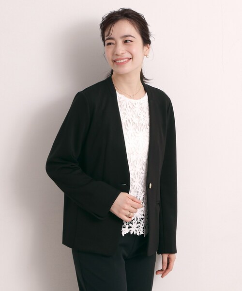 【デザイン】 通勤スタイルからセレモニー対応まで幅広く活躍。 着心地柔らかなジャージー素材ジャケット。 すっきりシャープな印象で着られるノーカラーデザイン。 非常に柔らかなダンボールジャージー素材を使用しているため滑らかさと軽さが魅力。 伸縮性もあるので堅苦しくなく快適な着心地。 表面感のあるゴールドボタンのアクセントがさり気ない華やかさをプラス。 スリット入りの袖口デザインで折り返して着用できます。 同素材のワンピース【P93-55001】とセットでの着用が可能です。 【素材】 滑らかな肌触りと柔らかさが特徴のダンボールジャージー素材。 【仕様】 ・ポケット数:前×2 ・裏地なし ※照明の関係により、実際よりも色味が違って見える場合があります。また、パソコン・スマートフォンなどの環境により、若干製品と画像のカラーが異なる場合もございます。 ---------------------------------------- ★お気に入り登録がおすすめ★ ▽気になる商品はハートマークをクリック! ・再入荷やセールの通知をお知らせ ・お気に入り一覧からいつでもチェック ▽ブランドのお気に入り登録も! ・新商品やお得な情報をいち早くお知らせ ---------------------------------------- モデル情報:身長165cm B82 W60 H88 着用サイズ:00(フリーサイズ) 店舗へのお問い合わせ商品番号:P93-45005 ●製品寸法: 00(フリーサイズ):着丈58cm B98cm 袖丈56cm 肩幅38cm 備考:重量:00(フリーサイズ)約360g