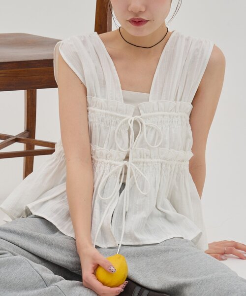 【umm. 2026 SS collection】 umm.アイテム一覧はこちら▶▶ 昨年人気のトップスがNEW生地で今年も登場♪ ・ブラック・オフホワイトはレース素材、ブラックその他1は表面感あるチェック生地を使用しています。 ・シャーリングやフロントリボンを施しており、360°可愛いトップス◎ ・インナー次第でオールシーズン着用いただけます! ●スタイリング ・ロンT を合わせれば春も秋も◎ ・キャミソールやタンクトップと合わせたヘルシーな夏コーデ ・柔らかさのあるデザインなので、デニムやスウェットパンツなどカジュアルなアイテムとの合わせがおすすめ! ●おすすめのスタイリングアイテム ▶サイドレースデニムワイドパンツ ▶サイドレーススウェットパンツ ▶吸水速乾カップ付キャミソール *********************** 洗濯方法:- 裏地:なし 透け感:なし 伸縮性:なし 光沢感:なし 生地の厚さ:普通 *********************** ●STAFF着用コメント 153cmスタッフ:首元がVネックのようなデザインになっているので、トップスをレイヤードしてもすっきりとした印象になります。やや甘めな印象になるので、カジュアルなデザインのボトムスと合わせて着たいです。 158cmスタッフ:今年はレース素材とチェック柄に!生地感に華やかさがあるので、シンプルなトップスを合わせてコーデのメインとして合わせたいです◎ 【カラー表記について】 システム上の都合により、一部カラー名がサイト表記と異なる場合がございます。 【入荷時期について】 入荷日ごとに販売数量が決まっているため、オンラインでは完売後に次期納期の数量にて予約販売を行っております。 店舗入荷時期と予約商品のお届け時期が異なる場合がございますので、予めご了承ください。 ※追加入荷のある商品もございますので、詳しい店舗入荷時期に関しましてはお近くの店舗へお問い合わせください。 ※店舗の在庫状況に関しましては、こちらのページに記載されている「店舗在庫」から確認にしていただけます。 「在庫あり」の表記でも、お取り置き分などでお客様に販売できない場合がございます。 ※予約商品でも、店舗では追加がない場合もございます。ご了承ください。