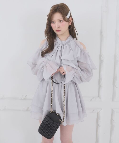 【Romantic Bloom collection】 3/19(木)10:00販売開始♪ ボリューム感のあるフリルとリボンが目を惹く、可愛さ満点のミニワンピースが登場♪ ■デザイン 可愛らしさとフェミニンさを兼ね備えた、ガーリーながらも大人っぽさを感じさせるアメスリミニワンピース。 衿元から袖にかけてたっぷりとシアーフリルをあしらい、程よい肌見せを叶えつつ二の腕をさりげなくカバー。 華奢見え効果も期待できます。 スカート部分は3枚重ねのデザインで、動くたびにふんわりと広がり華やかな印象に。 リボンは前で斜めに結べば甘めな雰囲気に、後ろで結べばすっきりとしたきれいめスタイルにアレンジ可能です♪ ※リボンは取り外し可能です。 ■サイズ感 ウエストはゴム仕様で、自然にフィットしメリハリのあるシルエットに。 スカート部分はミニ丈で、脚長効果も期待できます。 ※ウエストゴム最大幅:112cm ■スタイリング 一枚で主役級の存在感を放つアイテム。 ロングブーツを合わせて甘さを引き締めた大人フェミニンスタイルがおすすめです。 デニムをレイヤードしてカジュアルにまとめるのも◎ 1062036305 ◎ショルダーリボンフリルビスチェ と合わせて、リンク感のある“双子コーデ”も楽しめます♪ ・・・・・・・・・・・・・・・・・・・・・・ 透け感:あり(全色:袖部分・裾部分) ややあり(アイボリー・アイボリー柄・ブルー柄:全体) 裏地:あり 伸縮性:あり(ゴム部分) 光沢感:ややあり 生地の厚さ:普通 ・・・・・・・・・・・・・・・・・・・・・・ ■商品のお気に入り登録:再入荷通知やのこりわずか、お得なプライスダウンの情報も受け取ることができます。 ぜひご登録ください◎ ※サンプルでの撮影の為、製品と仕様が異なる場合がございます。 ※商品の色味は、撮影場所や光のあたり具合などにより色味が違って見える場合がございます。 また、お客様のお使いのモニター環境などにより色味が異なって見える場合がございます。 予めご了承の上ご注文下さい。