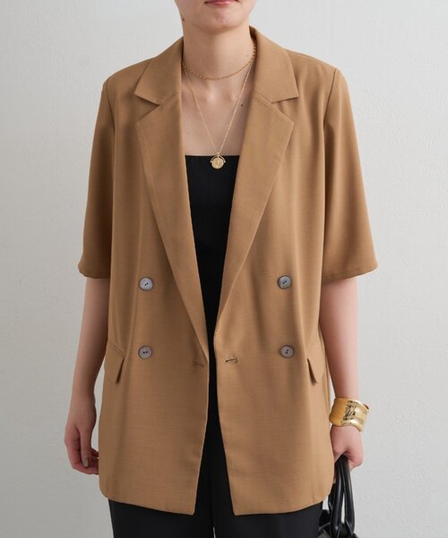 きちんと感と涼しさを両立、ハーフスリーブジャケット。 ■デザイン ぷるんとした質感でシワになりにくい素材を使用し、動いても座っても美しいシルエットをキープ。 きちんと感がありながらもストレスフリーな着心地を叶えます。 ダブルブレストの上品なデザインと、顔周りをすっきり見せるテーラードカラーで、羽織るだけで洗練された印象に。 半袖仕様で暑い季節も快適に着られ、冷房対策にも活躍する一着です。 ■コーディネート オフィスでのビジネスシーンから、リモートワークでのオンライン会議、ちょっとしたお出かけや女子会、結婚式や二次会などのパーティーシーンまで幅広く活躍します。 Tシャツ×デニムにさっと羽織れば、こなれ感のあるカジュアルミックススタイルに。 ワンピースやスカートと合わせればフェミニンな印象に仕上がり、ブラウス×パンツと合わせればきちんと感のあるオフィススタイルが完成します。 ■素材・洗濯表記 素材:ポリエステル100% 洗濯表記:ドライクリーニング推奨 ●この製品は摩擦(特に湿った状態での摩擦)や、雨や汗などに濡れた場合は、他の衣料に色が移ることがあります。 ●過度の摩擦を受けると擦れや破れの原因になることがあります。 ●直射日光や蛍光灯の長時間照射により、色あせすることもあります。 ●外部からの熱にご注意ください。 ●高温多湿を避け、光の当たらない場所に保管してください。 【お気に入り登録でお得な情報をお知らせいたします 】 完売カラーの再入荷やラスト1点の通知、セールの通知を受けとることができます。 【ブランドのお気に入り登録】 新商品や再入荷、いち早くセールやクーポンなどのブランドの情報を受けとることができます。 生産の都合上、お届け時期が前後する場合がございます。 システムの都合上、店舗より入荷が遅れる場合がございます。 実際にお届けする商品と仕様やサイズが異なる場合がございます。 照明や光の当たり具合で色味が違って見える場合があります。
