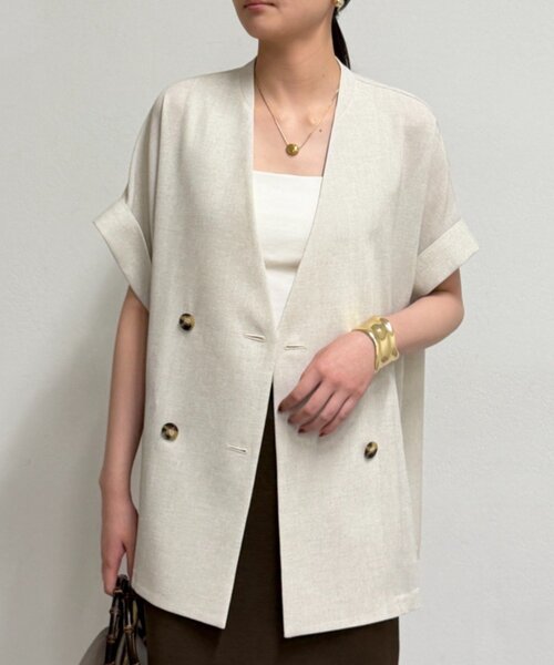 軽やかな着心地と、さりげないこなれ感を演出するスラブWジャケット ■デザイン 表情感のあるスラブ調素材を使用し、ナチュラルでこなれた印象に。 ドライな素材感で、春夏シーズンに最適な軽やかさです。 ノーカラー×Vネックデザインで、顔周りをスッキリと見せてくれます。 フロントはダブルボタン仕様で、きちんと感も。 身幅にゆとりを持たせたリラックス感のあるシルエットです。 ■コーディネート ブラウスやタイトスカートと合わせて、きちんと感を出せばオフィススタイルにも。 ワンピースやワイドパンツと合わせて、リラックス感のある大人スタイルに。 ■素材・洗濯表記 素材:ポリエステル86% アセテート14% 洗濯表記:手洗い可 ●手洗いで軽く押し洗いしてください。 ●浸け置き洗いは避け、洗濯後はすぐに脱水して、形を整えて陰干ししてください。 ●アイロンの際は、当て布をしてください。 ●ご使用の際は、引っ掛けに十分ご注意ください。 【お気に入り登録でお得な情報をお知らせいたします 】 完売カラーの再入荷やラスト1点の通知、セールの通知を受けとることができます。 【ブランドのお気に入り登録】 新商品や再入荷、いち早くセールやクーポンなどのブランドの情報を受けとることができます。 生産の都合上、お届け時期が前後する場合がございます。 システムの都合上、店舗より入荷が遅れる場合がございます。 実際にお届けする商品と仕様やサイズが異なる場合がございます。 照明や光の当たり具合で色味が違って見える場合があります。