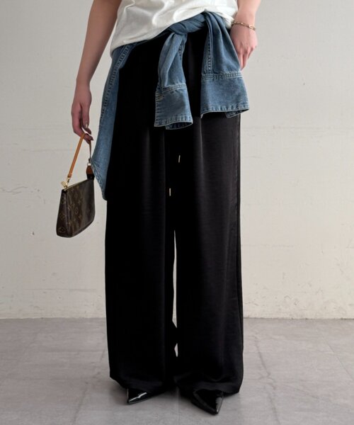 上品な光沢感をまとって、大人の余裕を演出するサテンワイドイージーパンツ。■デザインマットなツヤ感のあるサテン生地が、カジュアルながらも洗練された印象を演出。落ち感のある素材が美しいドレープを生み、歩くたびに優雅なシルエットを描きます。ウエストは紐で調整可能で、リラックス感とすっきり見えを両立。ワイドシルエットで体型カバーも叶う一着です。■コーディネートTシャツやカットソーと合わせればカジュアルに、ブラウスやシャツと合わせればきれいめな印象に。合わせるトップス次第でさまざまな表情を楽しめる、着回し力の高い万能アイテムです。■素材・洗濯表記【ブラック】ポリエステル100%【アイボリー】ポリエステル100% 裏地ポリエステル100%洗濯表記:手洗い可●この製品は摩擦(特に湿った状態での摩擦)や、雨や汗などに濡れた場合、他の衣料に色が移ることがあります。●過度の摩擦を受けると擦れや破れの原因になることがあります。●直射日光や蛍光灯の長時間照射により、色あせすることもあります。●外部からの熱にご注意ください。●高温多湿を避け、光の当たらない場所に保管してください。【お気に入り登録でお得な情報をお知らせいたします 】完売カラーの再入荷やラスト1点の通知、セールの通知を受けとることができます。【ブランドのお気に入り登録】新商品や再入荷、いち早くセールやクーポンなどのブランドの情報を受けとることができます。生産の都合上、お届け時期が前後する場合がございます。システムの都合上、店舗より入荷が遅れる場合がございます。実際にお届けする商品と仕様やサイズが異なる場合がございます。照明や光の当たり具合で色味が違って見える場合があります。