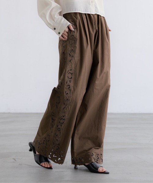 ■素材■ 細番手のコットンを使用したブロード生地にレース刺繍を施しています。 天然繊維の柔らかで自然な表情が特徴の素材になります。 ■デザイン■ サイドに伸びる繊細なカットワークレースが目を引く、華やかな印象のレースパンツ。 ウエストは、ゴム仕様で甘くなりすぎないデザインで、 カジュアルにもきれいめにも取り入れやすい一本です。 ■スタイリング■ トップスはシンプルなTシャツやブラウスを合わせることで、レースの柄が引き立ちます。 足元はサンダルでリラックス感を、パンプス合わせできれいめな着こなしもおすすめです。