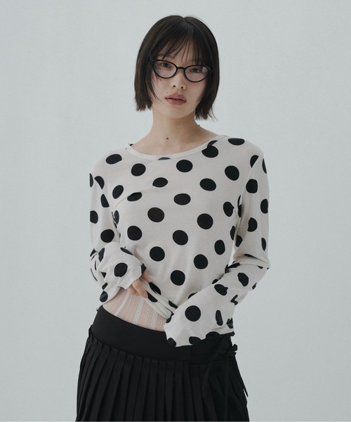 polka dot long sleeve tee / ドットロンTまだまだドットトレンドはおわらない!!、、でもこんき少し違うのは大粒ドットが熱いということ。feketeからは一枚でもインナーに忍ばせてもデイリールックで重宝すること間違いなしなロンTが登場!!お袖と裾は長めのデザインでアウターや羽織の下から覗かせることができインナーでもポイントに◎伸縮性の高い着心地の良い素材です。※素材の特性上、柄の配置が一点一点異なりますのであらかじめご了承ください。※サイズ詳細はサイズスペックをご参照ください。(モデル着用サイズは写真下に記載がございます。)※商品の色味は詳細画像をご参照ください。※ご覧のモニター環境や撮影環境により実際の商品と多少色味が異なって見える場合がございます。ご理解の程よろしくお願いいたします。※詳しいお手入れ方法は商品タグをご参照ください。◎商品のお気に入り登録ラスト1点・再入荷・セール等の通知を受け取ることが出来ます。◎ブランドのお気に入り登録新商品や再入荷、ショップのおすすめトピックスなど、いち早くブランドのお得な情報を受け取ることができます。