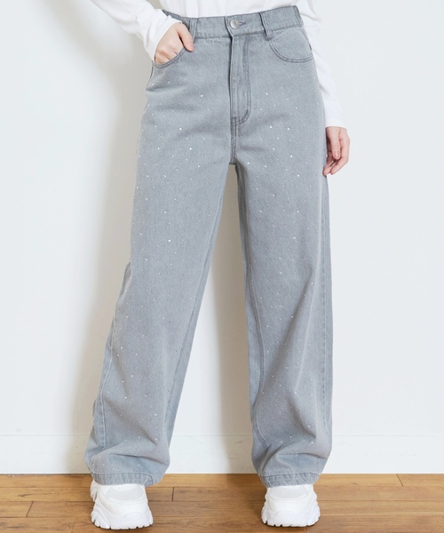 存在感抜群のストーンデザインがコーディネートを格上げするデニムパンツです。 シンプルなトップスと合わせるだけで、オシャレ映えするスタイリングが完成します。 程よくゆったりとしたシルエットで、はき心地も快適。 デイリー使いはもちろん、トレンド感のある着こなしにも活躍する一本です。 【おすすめの着用時期は春夏シーズン】 【透け感】透けない 【生地の厚さ】普通 【伸縮性】あり 【裏地】なし 【ポケット】あり 【アジャスター】あり