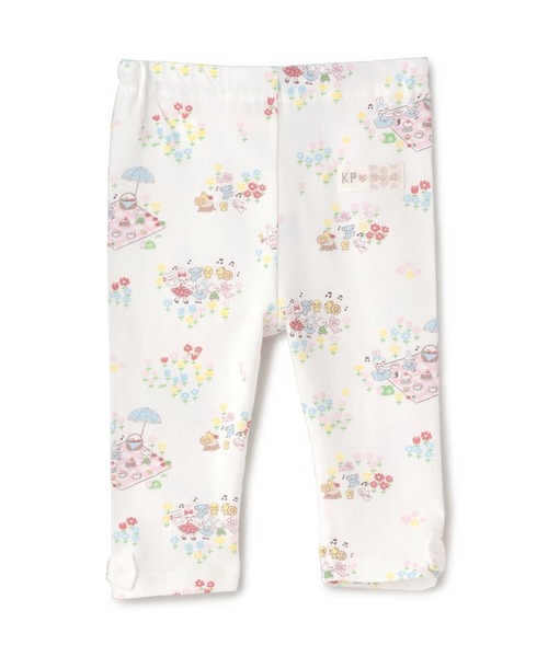 伸びの良いベア天竺の総柄7分丈スパッツ。動きやすい穿き心地です。裾の両脇には共地のリボンが付き、さりげないポイントに。カラーごとに柄が異なり、印象の違いを楽しめるので、柄違いで揃えても。03)オフホワイト:mimiちゃんと森の動物たちがピクニックを楽しむ様子の総柄プリント / 50)紺:小さなリボン総柄 / 61)ラベンダー:ギンガムにチェリーとリボン、カップケーキを散りばめた総柄
