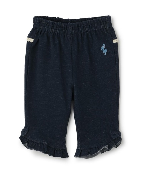 ストレッチの利いたデニム調のニットツイルを使用した6分丈パンツです。ベーシックなデザインながら、裾のフリルと、後ろ身頃にはさみ込んだゴムレースが、可愛らしい仕様。裾の両脇には、共地のリボンも付いています。ウェスト総ゴム仕様で穿きやすく、またトップスを選ばず、着回ししやすい1枚。色違いで揃てみても。