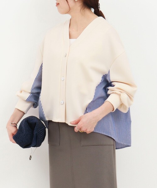 ◇26SS◇MICO COULIERきれいめに、ほどよい洒落感。一枚で着映えるドッキングカーディガンきれいめなダンボールニットとストライプシャツを組み合わせた、ドッキングデザインのカーディガン。一枚でスタイルが整い、オンオフ問わず活躍します。◆Point・ダンボールニット×ストライプシャツの異素材ドッキングデザイン・春夏らしい軽やかさと、きれいめな表情を両立・綿タッチの滑らかな肌触りと伸縮性で快適な着心地・程よくハリ感があり、シルエットをきれいにキープ・Vネックデザインで顔まわりをすっきりと演出・スカートにもパンツにも合わせやすい丈感&ヘムライン・デザイン性がありながらも着回しやすく、きれいめにもカジュアルにも対応・きちんと感+今っぽさが自然に叶う、オフィススタイルにもおすすめのカーディガン----------------------------------------------------------透け感:キナリのカットソー部分のみ若干あり裏地:なし伸縮性:本体(カットソー部分)のみあり光沢感:なし洗濯:手洗い可----------------------------------------------------------気になる商品は、お気に入り登録(ハートマークをタップ!)がオススメですクーポン情報や入荷情報など、お得な通知が受け取れるようになります----------------------------------------------------------●お取扱い上のご注意●末永くご愛用頂くために、アテンションタグを必ずご確認の上、着用又はお取り扱い下さい。※店頭及び屋外での撮影画像は、光の当たり具合で色味が違って見える場合があります。商品の色味は、スタジオ撮影の画像をご参照下さい。※商品画像に関しては出来る限り忠実に表示出来るよう努めておりますが、お客様がご利用のモニターの設定及び特性により、実際の商品と比較し色味に若干の誤差が生じる場合があります。※製品洗い加工の商品は、多少の歪み、シワなどが見られたり、風合いやサイズ等が1枚1枚異なります。汗や雨等で濡れた時や、摩擦により色落ちし、他の衣料を汚すことがありますので(特に濃色のもの)ご注意ください。<MICO COULIER>今の気分をノーリーズらしく取り入れたデイリーアイテムを提案します。ウエアからグッズまで幅広いラインアップ。やわらかく透明感のある着こなしで新しい自分を発見。MICO COULIERの商品につきましてはアウトレット店舗にて展開をしております。