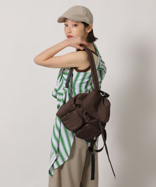 コンパクトなサイズ感のミニリュック。 フロントには2つ、内側には1つポケットつきで、小物の整理も◎ 背面にもファスナー付きなので、メインポケットの荷物を楽に出し入れできます。 カジュアルはもちろん、ワンピースなどのフェミニンにも合わせすいアイテムです。
