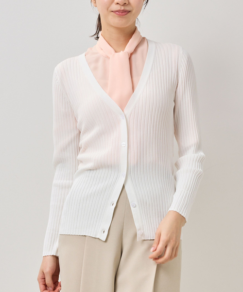 太さのあるリブ素材が縦のラインを強調し、すっきりとしたスタイリングを楽しめるカーディガン。リブ素材のフィット感は残しつつ、締め付けすぎないシルエットと編地のバランスにこだわりました。ウエストラインまで隠れるミドル丈のルックスがポイント。フロントボタンの開閉によっても印象の変化を楽しめます。スラックスやワイドパンツなど、様々なボトムスにも相性の良いアイテムです。・カラー展開は ホワイト、ブラック、ピンク・サイズ展開は1(M)9号・3(2L)13号