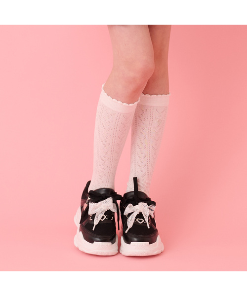 上品で大人っぽい雰囲気がただようモノトーンカラーのハイソックスです。サイドにあしらったロゴ刺しゅうがさりげないアクセント。肌が少し見える透かし編みで、コーデに抜け感がプラスされます。抗菌防臭加工をほどこしているのもうれしいポイントです。