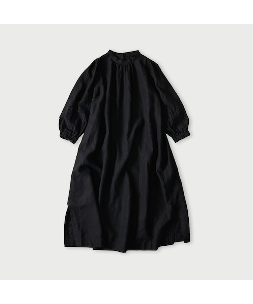 大切なリネン年々高騰するリネンですが、続けていきたい大切なものづくり。粗々しくハリがあって、粗野でムラのあるリネン糸を深いインディゴでお化粧したあと、ひと織りごとに締めながら高密度に丈夫に織りました。パフっと膨らませたお茶目な袖にカットワークを施しました。美しい落ち感を描くシンプルなリネンのドレスです。
