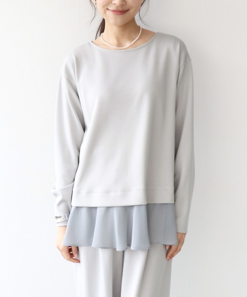 綺麗見えジャージーヘムフリルトップス 上品な表情のジャージー素材を使用した、綺麗見えヘムフリルトップス。 シンプルな身頃に裾のフリルをプラスし、さりげなく華やかな印象に仕上げました。 伸縮性のあるジャージー素材で着心地がよく、きちんと感とリラックス感を両立。 動くたびに揺れるヘムフリルがコーディネートに軽やかなアクセントを添えます。 パンツスタイルとも好相性で、デイリーからきれいめスタイルまで幅広く活躍する一枚です。 ■Point ・上品に見えるジャージー素材 ・動きのあるヘムフリルデザイン ・伸縮性があり快適な着心地 ・一枚で着映えするデザイントップス -------------------------------------- 透け感:なし 裏地:なし 伸縮性:あり ケア方法:手洗い可 ※お洗濯の際は洗濯表示を必ずご確認ください。 --------------------------------------